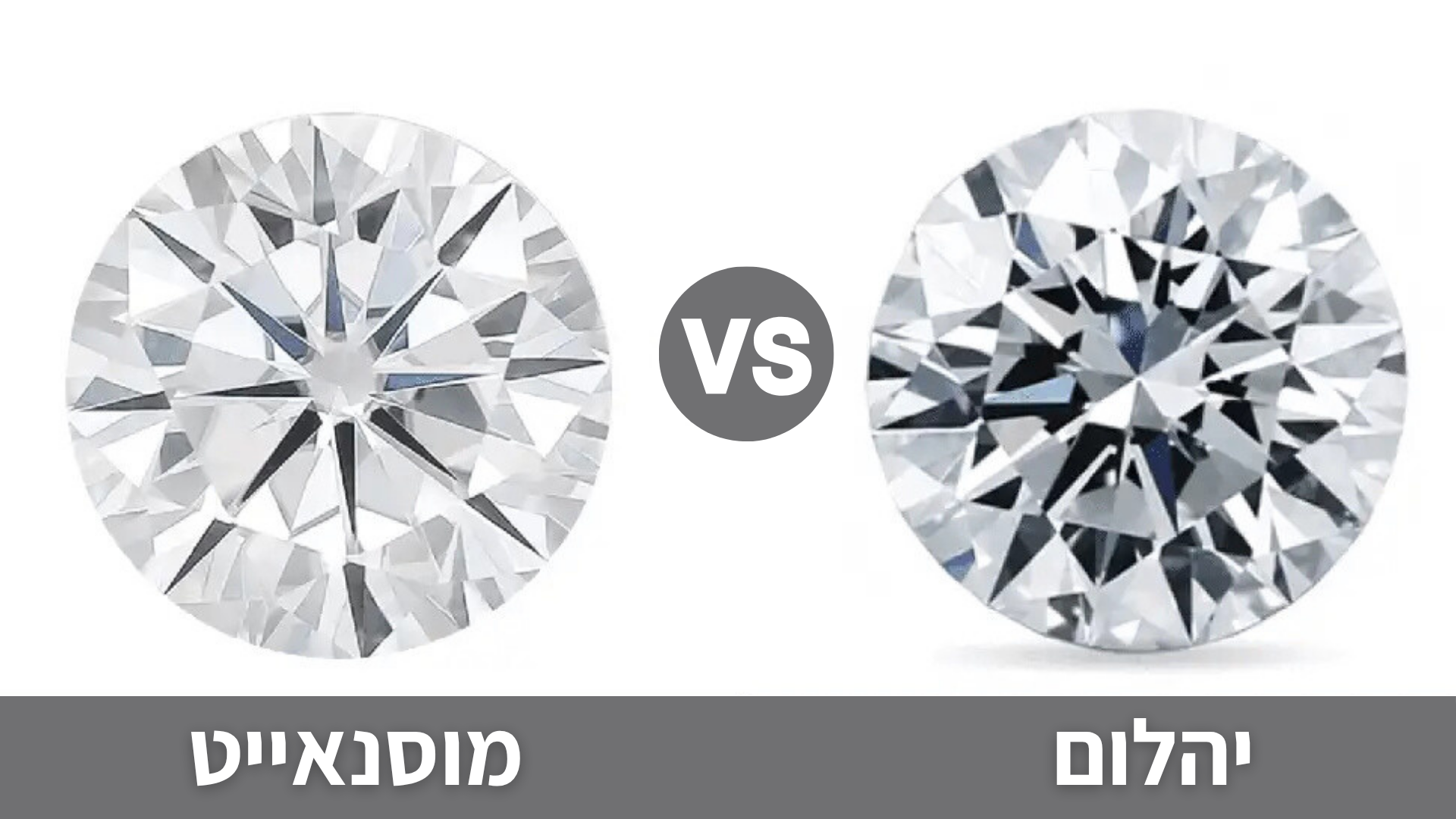 שני אבנים יקרות ונוצצות, אבל שונות לגמרי – היהלום טבעי ונדיר, עם קשיחות מקסימלית וברק עדין. מוסנאייט הוא אבן סינתטית עמידה מאוד, זוהרת יותר מיהלום ומחזירה אור בצבעים – מה שנותן לה מראה בוהק ובולט יותר, במחיר נמוך משמעותית.